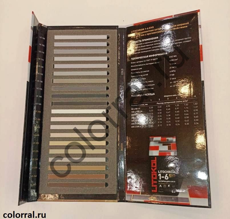 Litokol Litochrom - палитра цементной затирки для плитки содержит 26 образцов затирки для межплиточных швов Литокол. Образцы находятся в папке из которой их можно достать и приложить к плитке.