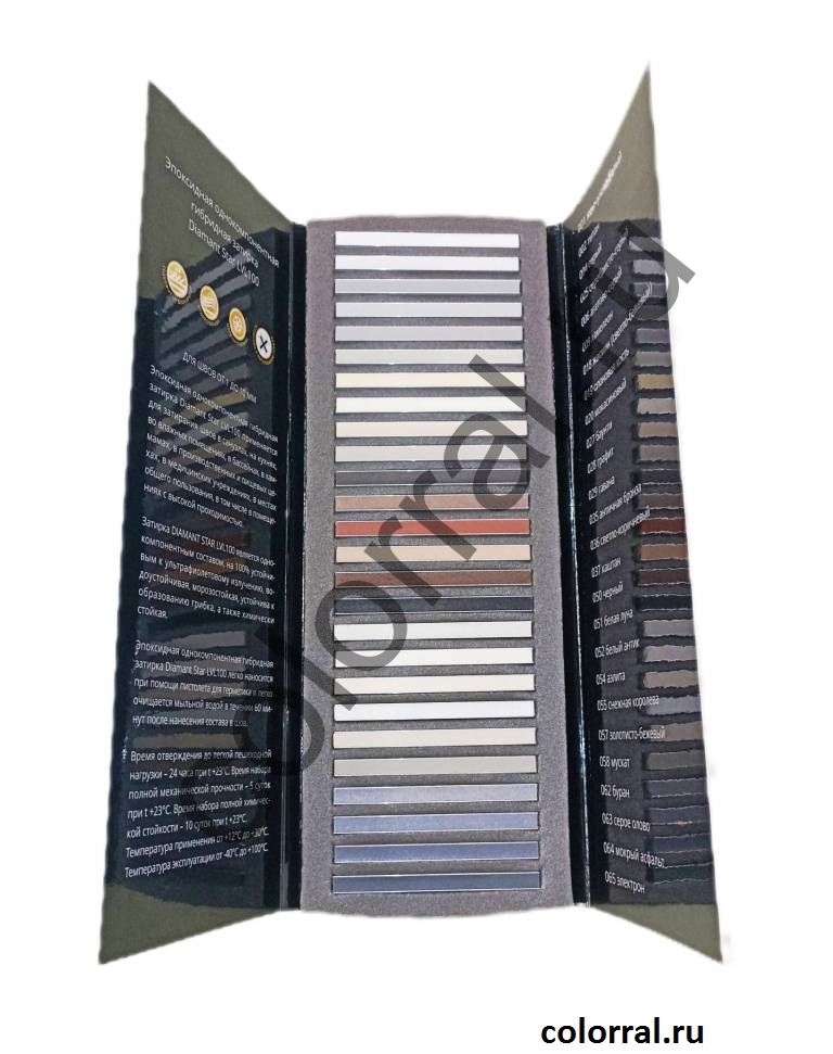 Палитра однокомпонентной эпоксидной затирки Diamant (LVL. 100) содержит 24 образца затирочной смеси для межплиточных швов Диамант. Образцы находятся в папке, из которой их можно достать и приложить к плитке. Данная затирка поставляется в стандартных тубах под пистолет для герметиков, что упрощает ее нанесение.